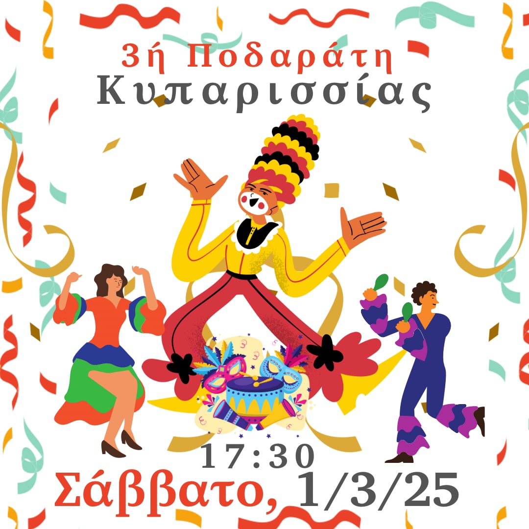 Φορέστε την αποκριάτικη στολή σας, συγκεντρώστε την παρέα σας και ελάτε να περπατήσουμε, να χορέψουμε και να γιορτάσουμε στους δρόμους της πόλης! Η 3η Ποδαράτη διοργανώνεται από όλους τους συλλόγους της πόλης υπό την αιγίδα του Δήμου Τριφυλίας και υπόσχεται να γεμίσει την Κυπαρισσία με ζωντάνια και κέφι. Ώρα έναρξης: 17:30 μ.μ.. Μην το χάσετε!