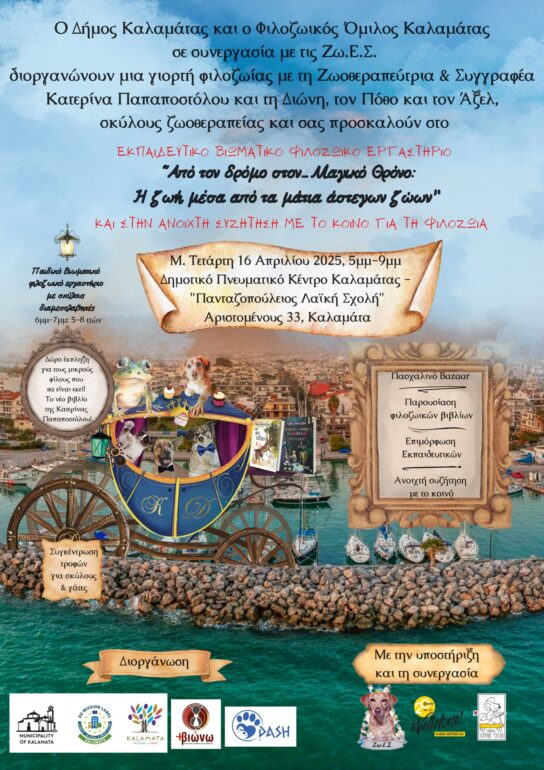 Από 15-18 Απριλίου 2025, θα πραγματοποιηθούν στην πόλη της Καλαμάτας δράσεις φιλοζωίας όπως εκπαιδευτικά προγράμματα, βιωματικά εργαστήρια με σκύλους διαμεσολαβητές, παρουσίαση φιλοζωικών βιβλίων, επιμόρφωση εκπαιδευτικών και ανοιχτή συζήτηση με το κοινό.