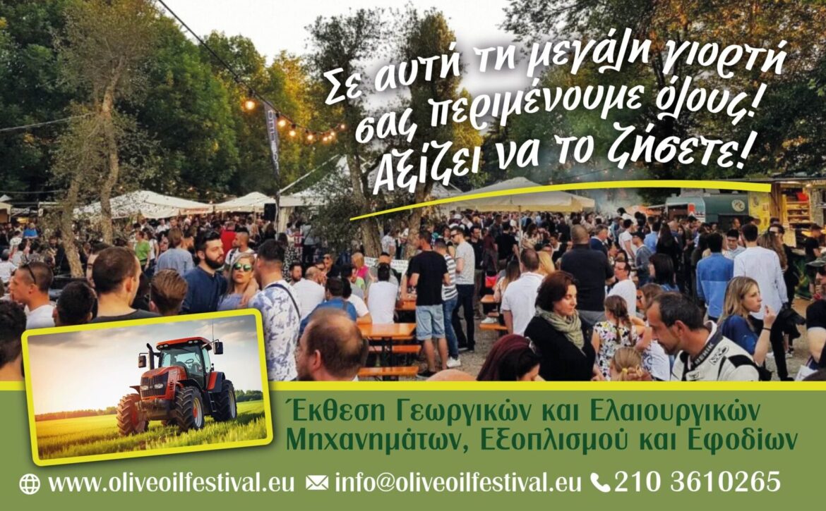 Η Καλαμάτα υποδέχεται για δέκατη συνεχή χρονιά το κορυφαίο γεγονός του ελαιοκομικού κλάδου στη Μεσόγειο! Το 10ο Φεστιβάλ Ελαιολάδου & Ελιάς, η μεγαλύτερη έκθεση στη Μεσόγειο για το Ελαιόλαδο & την Επιτραπέζια Ελιά καθώς και η Έκθεση Γεωργικών Μηχανημάτων που θα διεξαχθεί στις 30, 31 Μαΐου και 1 Ιουνίου 2025 στο Πάρκο Κυκλοφοριακής Αγωγής, υπόσχεται να αποτελέσει σημείο αναφοράς για τις τελευταίες εξελίξεις στην ελαιοπαραγωγή, τη μεταποίηση και την καινοτομία του κλάδου και τελεί υπό την Αιγίδα του Υπουργείου Αγροτικής Ανάπτυξης & Τροφίμων, της Περιφέρειας Πελοποννήσου, του Δήμου Καλαμάτας και του Επιμελητηρίου Μεσσηνίας.