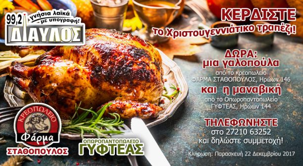 insert_link ΔΙΑΓΩΝΙΣΜΟΙ Ο Δίαυλος 99,2 σας κάνει ΔΩΡΟ το Χριστουγεννιάτικο Τραπέζι! today18/12/2017 8
