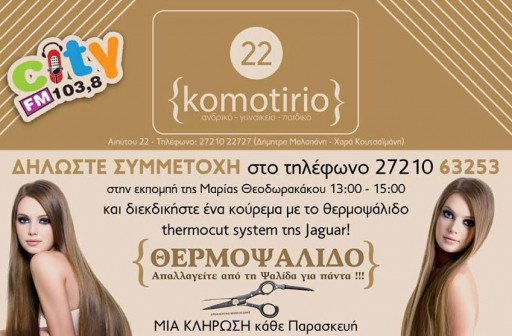 insert_link CITY FM 103.8 Ένα thermocut κούρεμα δώρο κάθε Παρασκευή από το Κομμωτήριο 22 και τον City 103,8! today26/03/2015 20