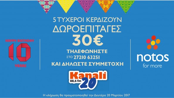 insert_link CITY FM 103.8 Κερδίστε 5 Δωροεπιταγές των 30€ από το πολυκατάστημα NOTOS! today16/03/2017 2