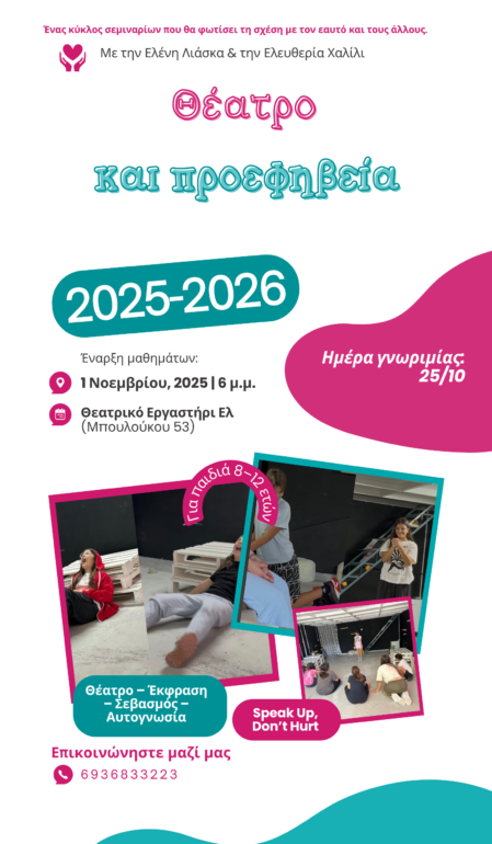insert_link 5 Art and Culture «Θέατρο & Προεφηβεία»: Μια βιωματική εμπειρία για παιδιά που θέλουν να γνωρίσουν τον εαυτό τους today17/10/2025 32 5